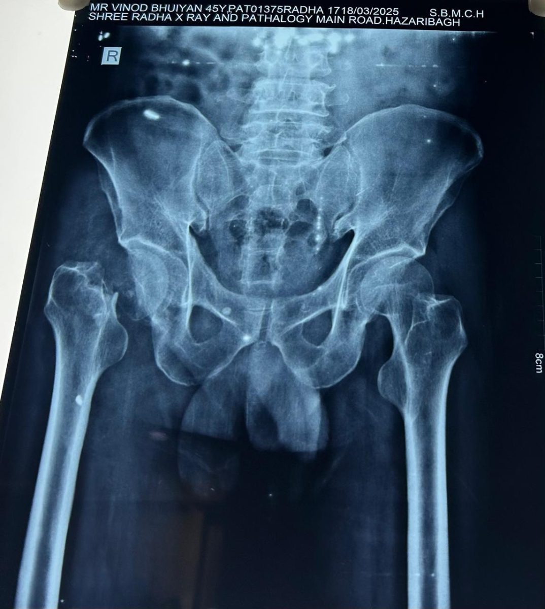 45-year-old male, sustained a fall from stairs over a month prior to presentation. He was initially managed conservatively at a local clinic, but experienced persistent hip pain, an inability to bear weight, and increasing difficulty performing daily activities. On evaluation at our center, clinical examination revealed limb shortening, tenderness, and restricted range of motion. Radiographs confirmed an old, displaced fracture of the femoral neck with no evidence of healing.